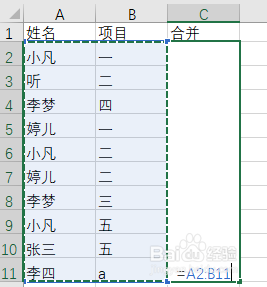 在C列输入“=A2:B11”后,单击F9,公式中的内容酿成了“={"小凡","一";"听","二";"李梦","四";"婷儿","一";"小凡","二";"婷儿","二";"李梦","三";"小凡","五";"张三","五";"李四","a"}”,删除公式最前面的“={”和最后面的“}”