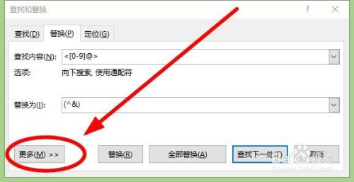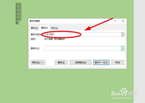 在“查找和替代”对话框的“替代”选项卡中的“查找内容”中输入“<[0-9]@>”。注重外面的大括号和里面的中括号都是在英文状况下利用键盘输入