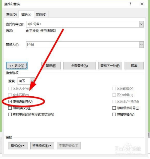在“替代为”输入框中输入“(^&)”