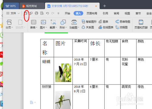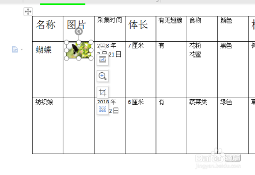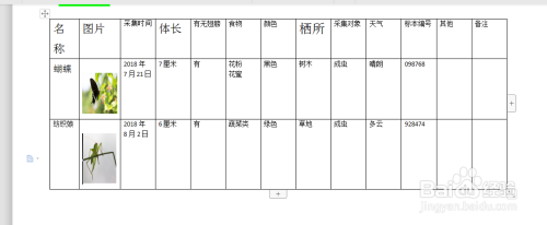 然后在里面填上,我们所看到虫豸的。信息如实的填到表格里面。在这张表格里我填了蝴蝶和纺织娘的一些信息。