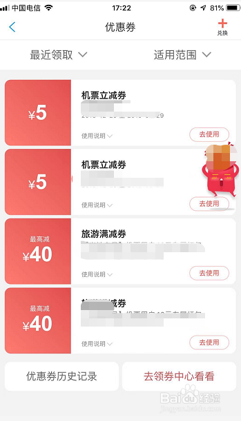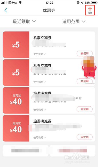 若是想用活动口令或者兑换码兑换携程优惠券,就点击优惠券本家儿页右上角的【+兑换】图标,如图所示!