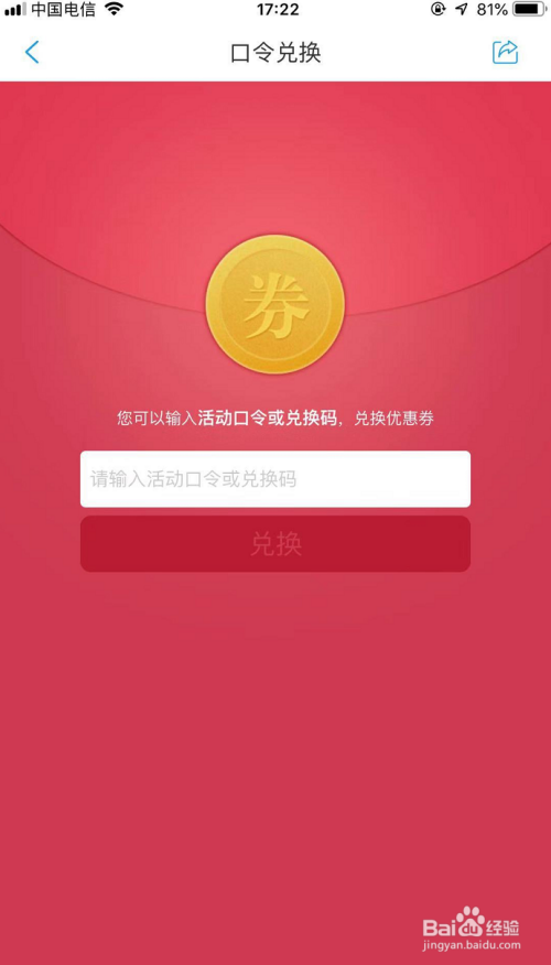 点击后,在如图所示口令兑换页面的白框中输入活动口令或兑换码,点击【兑换】即可兑换优惠券!