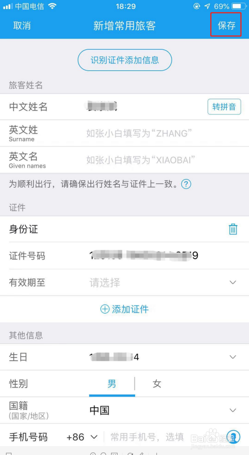 点击后页面再次回到新增常用搭客本家儿页,此时可以发现根基信息已经被系统主动填写完毕,查抄一下填写的项目是否准确,准确无误点击右上角的【保留】,常用信息就新增当作功了!