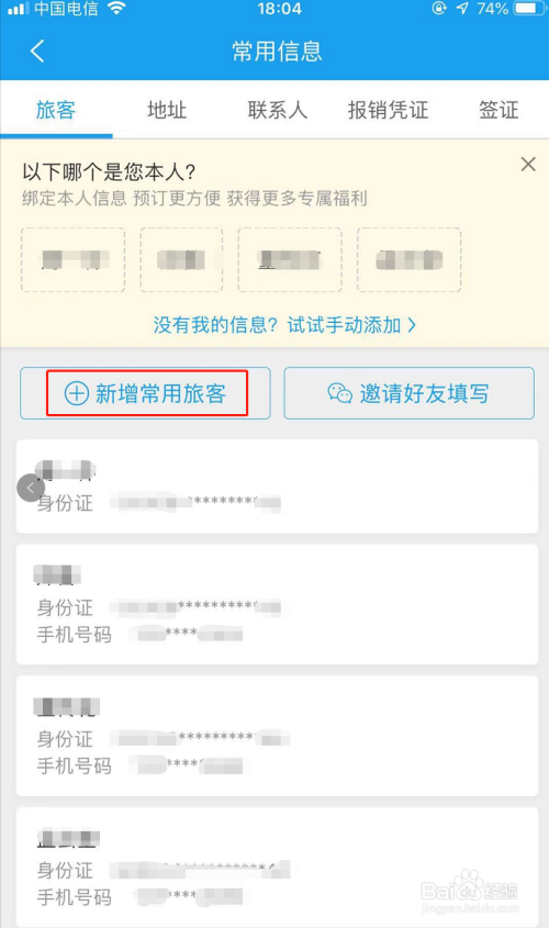 在新增常用搭客本家儿页下,可以直接填写常用搭客信息,也可点击第一栏【识别证件添加信息】,让系统主动识别证件并填写(保举)!(下面以点击【识别证件添加信息】为例)