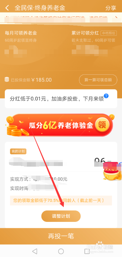 在支付宝全平易近保界面里直接点击下面的【调整打算】,如下图所示。