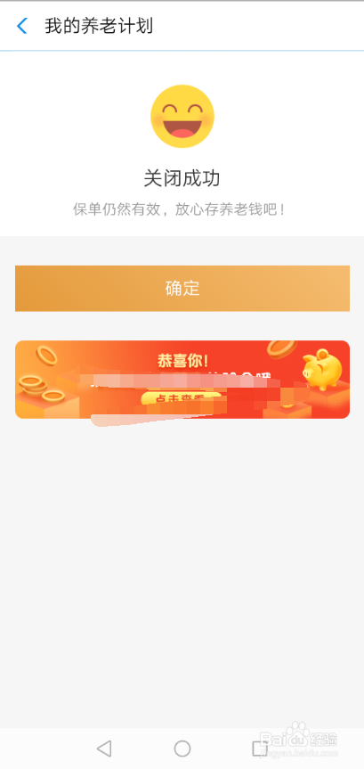暂停支付宝全平易近保我的养老打算当作功后,支付宝又封闭当作功提醒如下图所示。