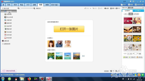 在“场景”分页面,我们点击的是“打开一张图片”将图片导入我们的建造区域,会等比例缩放显示在美图秀秀的工作区域