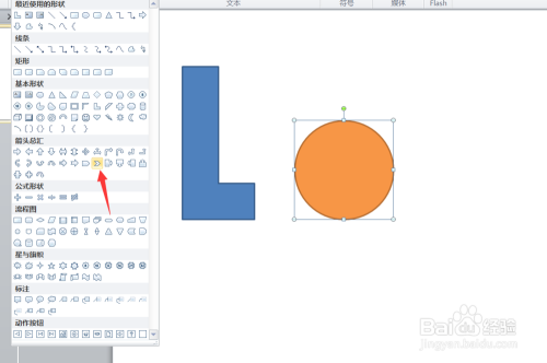 插入l型外形之后,我们再选择插入卵形外形,按下shift键,可以由椭圆变为正圆,接着我们设置椭圆的外形填充为橙色,如下图所示。