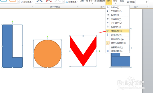 再接着我们选中我们插入的4个外形,然后点击横标的目的分布,整洁平均分布即可。