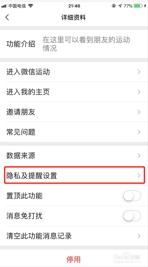 点击后进入微信活动的具体资料本家儿页,在具体资料本家儿页下找到【隐私及提醒设置】一项,点击该项!