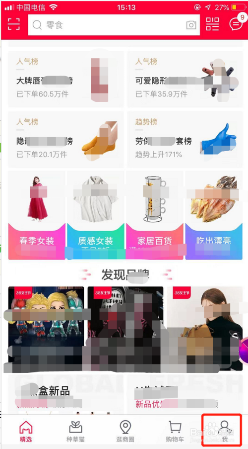 想要查看已保藏的商品的话,就回到手机天猫首页,找到首页右下角的【我】图标,如图所示,点击该图标进入我的本家儿页!