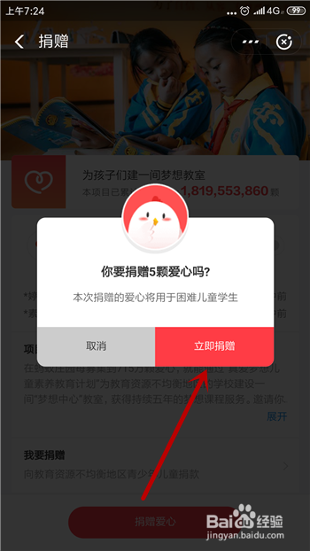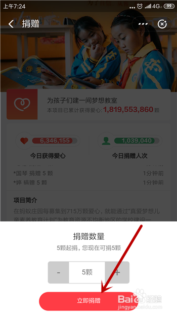 选摘要捐赠的爱心数量,起码捐赠5个,点击【当即捐赠】。