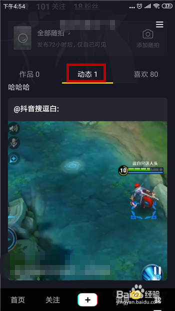 然后在小我本家儿页下方的【动态】里看到我们转发的视频。