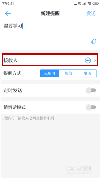打开辟送提醒界面后输入提醒的内容,点击【接收人】。