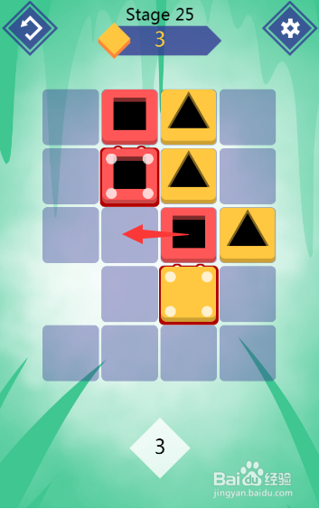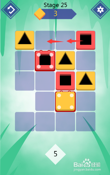 接着,将第三行第三列的夹杂图形左移,将第五行第二列的夹杂图形左移,即可将红色方块匹配消弭,如图所示: