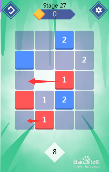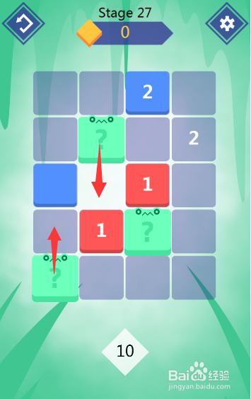 最后,将第四行第二列的夹杂图形上移,将第一行第三列的夹杂图形下移,即可将蓝色方块和数字2均匹配消弭,如图所示: