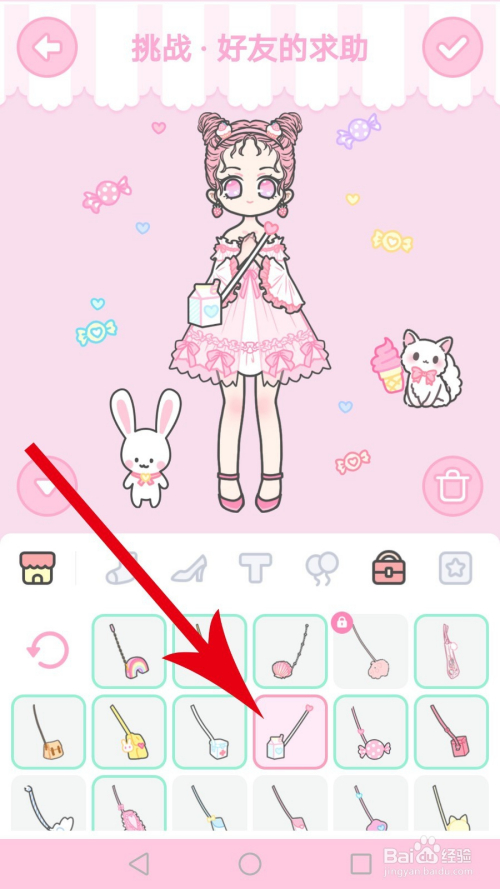 打开“饰品”分类,在这里需要找出3个穿搭物品,别离是带有小蛋糕的发卡、草莓耳坠和糖果布景图,找到后点击进行装扮,位置见下图