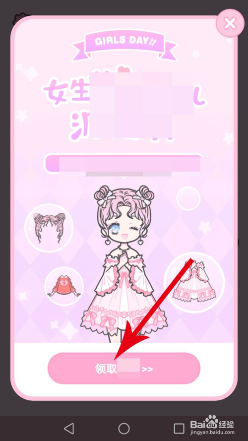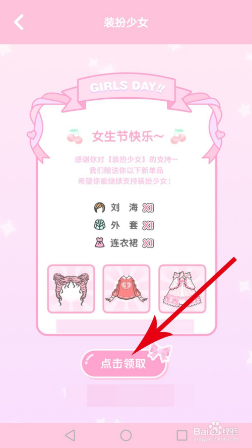 在手机上打开装扮少女app,打开“女生节”弹窗后点击“领取”,然后再在新打开页面中点击“点击领取”按钮