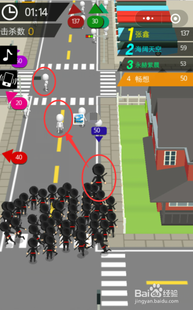 点击屏幕,摆布移动听物去碰撞到陌头白色的人物,就可以增进本身的步队人数。