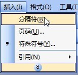将光标移动至文档封皮首页段落标识表记标帜结从头至尾处或是在目次、正文段落标识表记标帜起头处→选择东西栏中的“插入”选项→在“插入”选项中点击“分隔符”按钮→在“分隔符”弹窗中依次选平分页符、下一页。