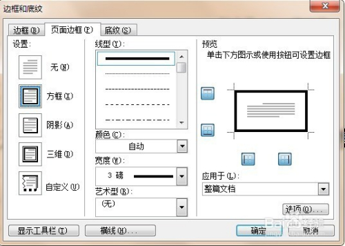 在“边框和底纹”窗口中点击“页面边框”→选择合适的线型、边框样式、线型宽度。
