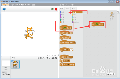 点击事务面板,添加当绿旗被点击时号令;