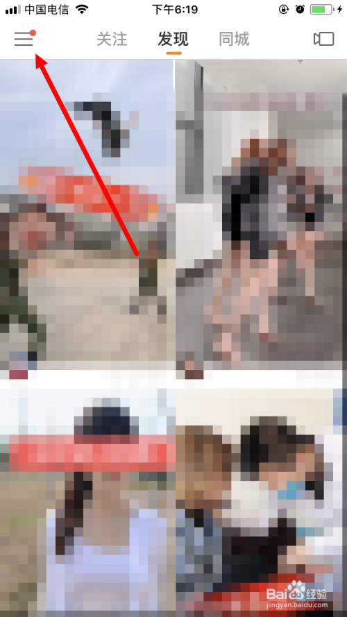 首先在手机上打开并登岸快手App,并在首页面点击左上角的标记。