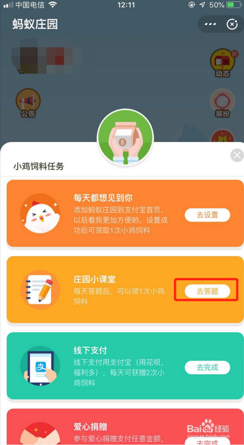 然后屏幕下方会弹出很多小鸡领饲料的使命,如图所示,在浩繁使命中找到【庄园小讲堂】一项,点击该项右侧的【去答题】!