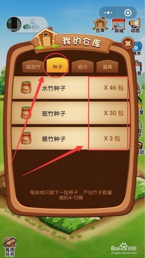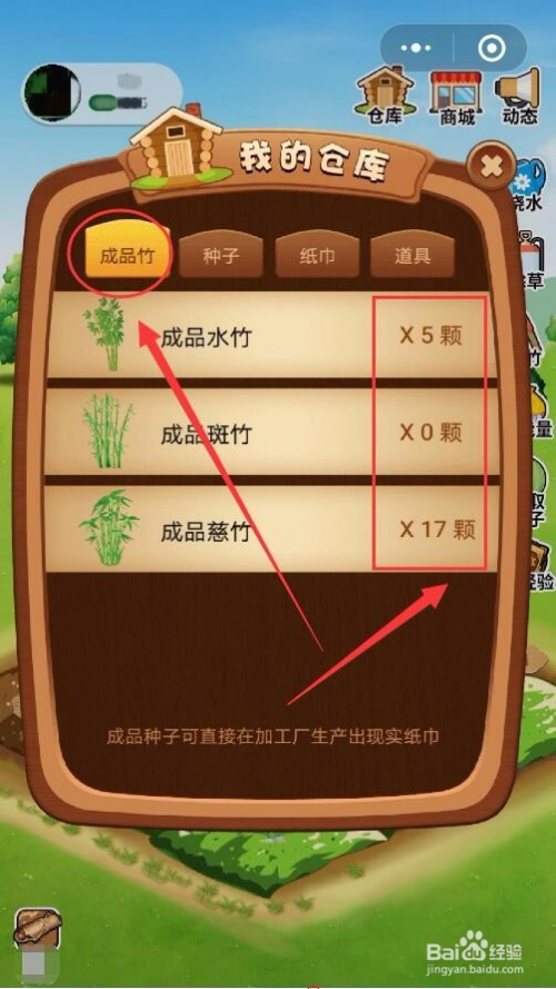 我的仓库当作品竹选项卡中,显示了收成的三种竹子数目,别离是水竹、斑竹和慈竹。