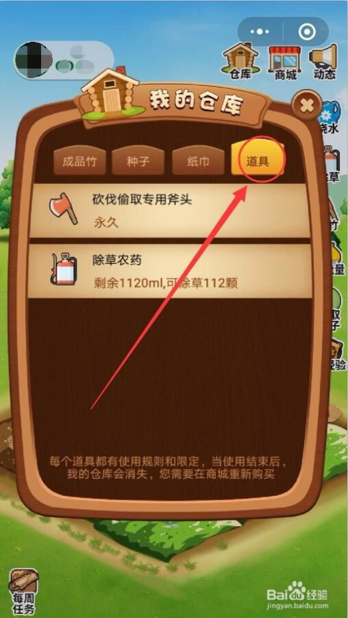 道具窗口中,会显示你所拥有的所有道具,一般为斧头、除草农药和水。