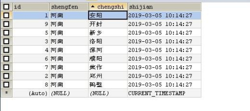 insert into `chengshi` (`id`, `shengfen`, `chengshi`, `shijian`) values('7','河南','焦作','2019-03-05 10:14:27');