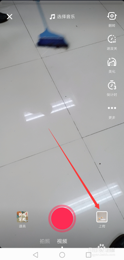 下面就是打开抖音APP,然后点击【+】进入拍摄界面,直接点击右下角的【上传】,如下图所示。