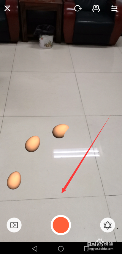 下面就是点击红色圆圈开启拍摄功能,然后用手点击屏幕就会呈现下蛋特效了,当然把摄像头瞄准位置结果更好,然后将下蛋视频保留,如下图所示。