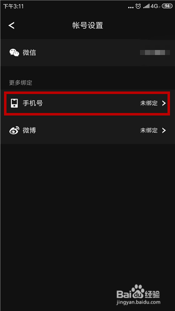 账号办理中可看到【手机号】,今朝是未绑定的状况,点击【手机号】。