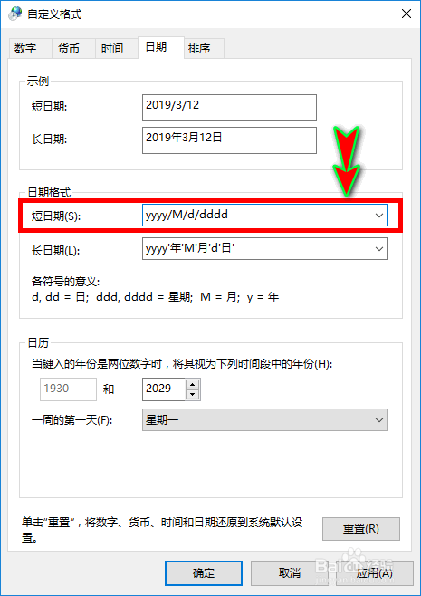接着在日期菜单下,找到“短日期”选项,将短日期后面的格局点窜为“yyyy/M/d/dddd”格局,后面新加的dddd就暗示添加了礼拜几。