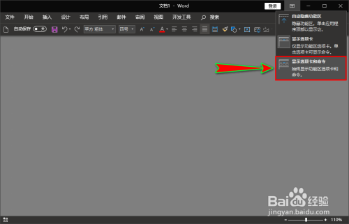 当然,若是不想要显示这些选项卡号令,我们可以点击“功能区显示选项”里面的“显示选项卡”,点击后就可以埋没这些选项卡号令了。若是,还想要显示更简练,可以选择“主动埋没功能区”,那就连菜单栏一路都不显示了。