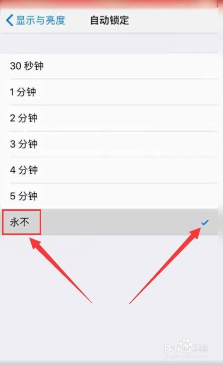 要想使屏幕常亮,就可以选择时候段中的“永不”按钮。