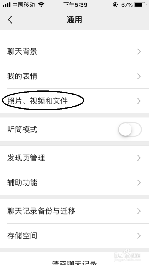 在通用选项界面下选择点击“照片、视频和文件”选项栏。