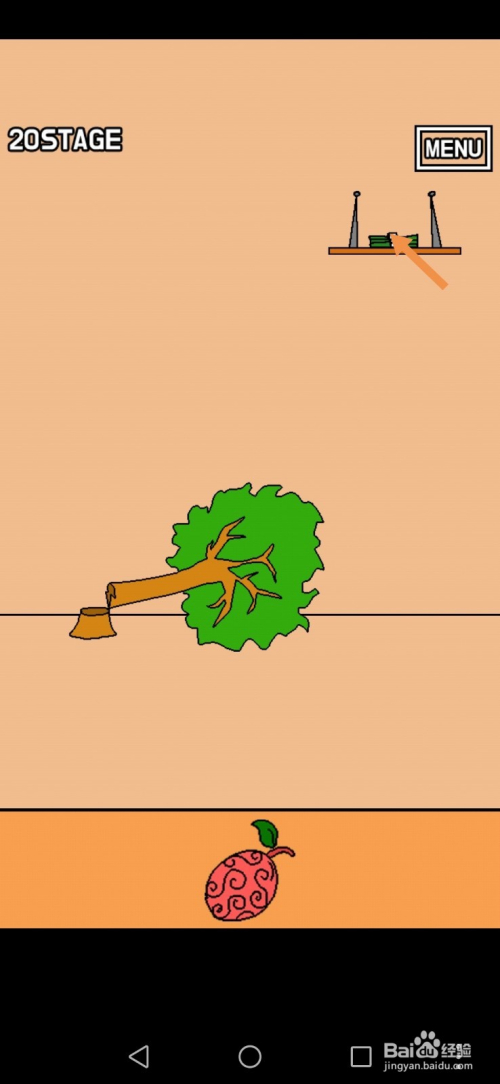 获得新斧头后,将斧头拖动到树上。砍断树后,点击从树上失落下来的果实,然后点击钱就过关了。