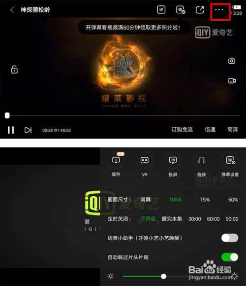 在屏幕右上角三个点,点击之后可以点击VR可以在VR眼镜下不雅看,还能投屏,弹幕设置等