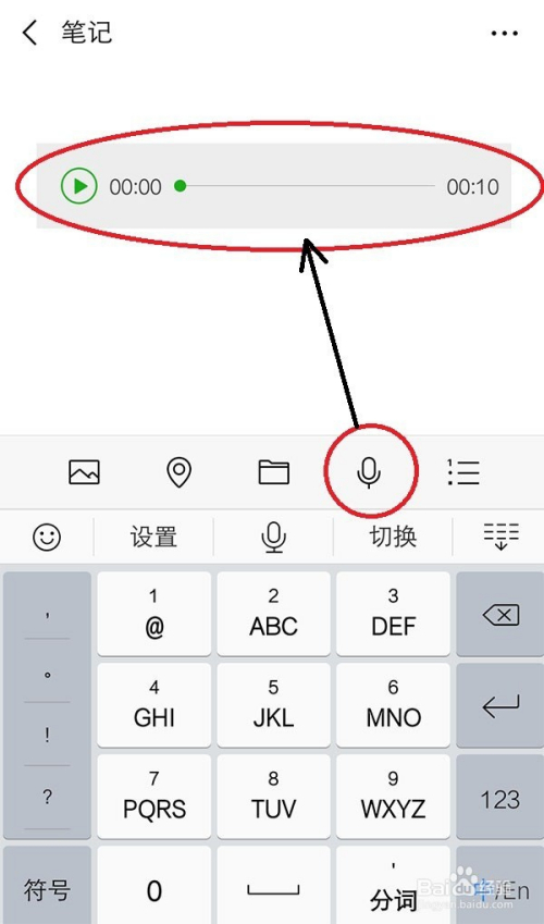 在笔记页面,点击【麦克风】就会起头灌音,再点击一次麦克风,灌音完当作后,就会有语音,如图所示。