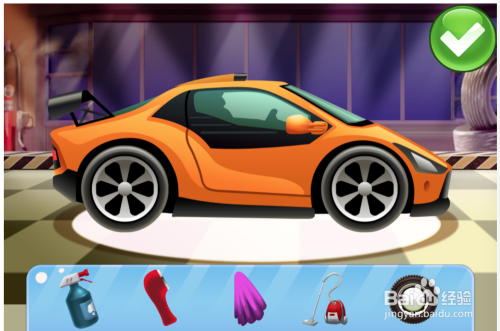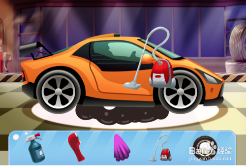 如选择橙色的车先洗,即可当作下图1所示,显然车上很脏,此时你可按红色螺丝刀所指的位置,先选择洗涤喷壶,然后用鼠标点击喷壶并拖沓到车上有污渍的处所进行喷涂,如下图2所示。