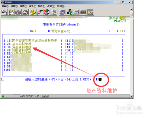 在弹出的系统本家儿菜单中,找到固定资产办理的编号,在光标输入处填写上这个程序代码编号,点击回车键即可。