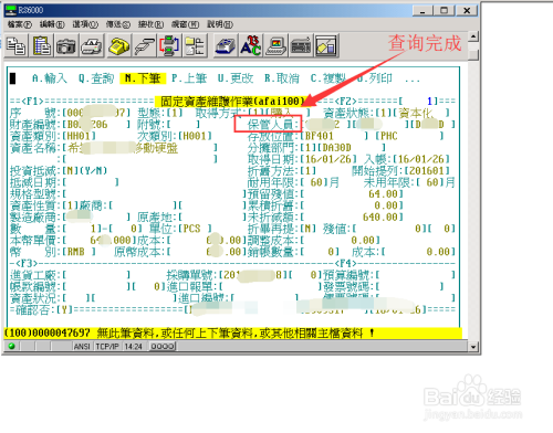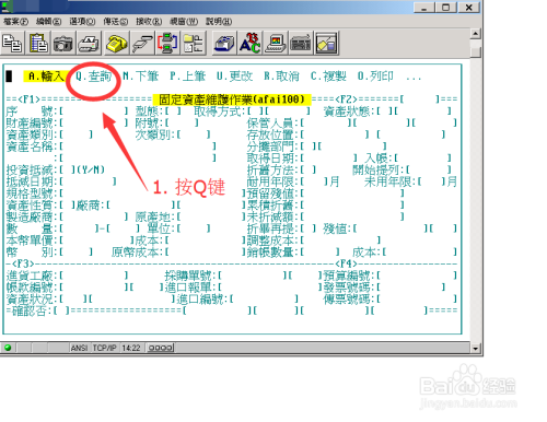 按键盘上的Q挪用查询快捷键,输入资产编号后一向按回车到资料显示出来即可。