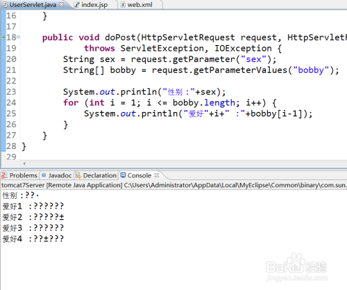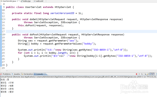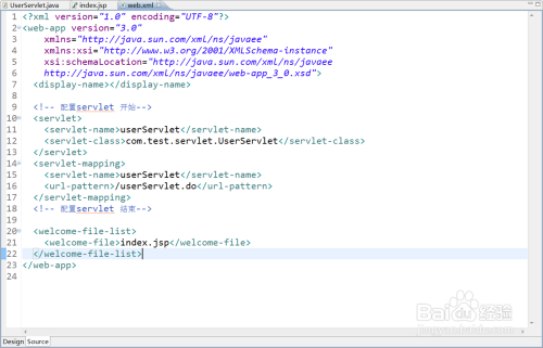 新建一个servlet UserServlet.java,index.jsp在web.xml中设置装备摆设servlet