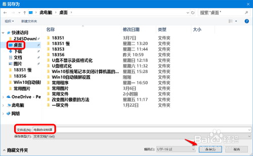 在打开的 另存为 窗口中,我们先点击窗口左侧的【桌面】,在文件名(N)栏中输入:电脑主动锁屏.reg,再点击:保留;