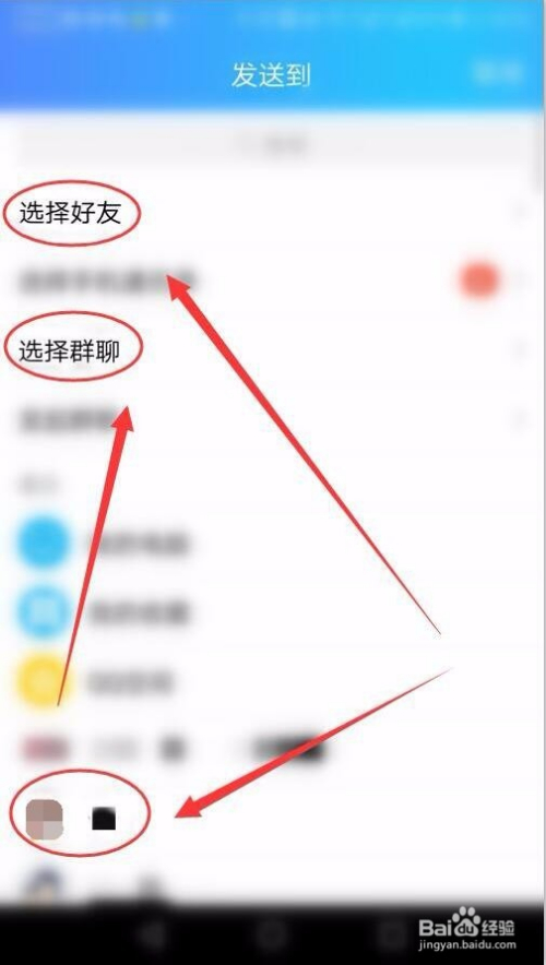 选择第三项后,呈现的发送窗口中,可以选择分享到的老友或群聊。