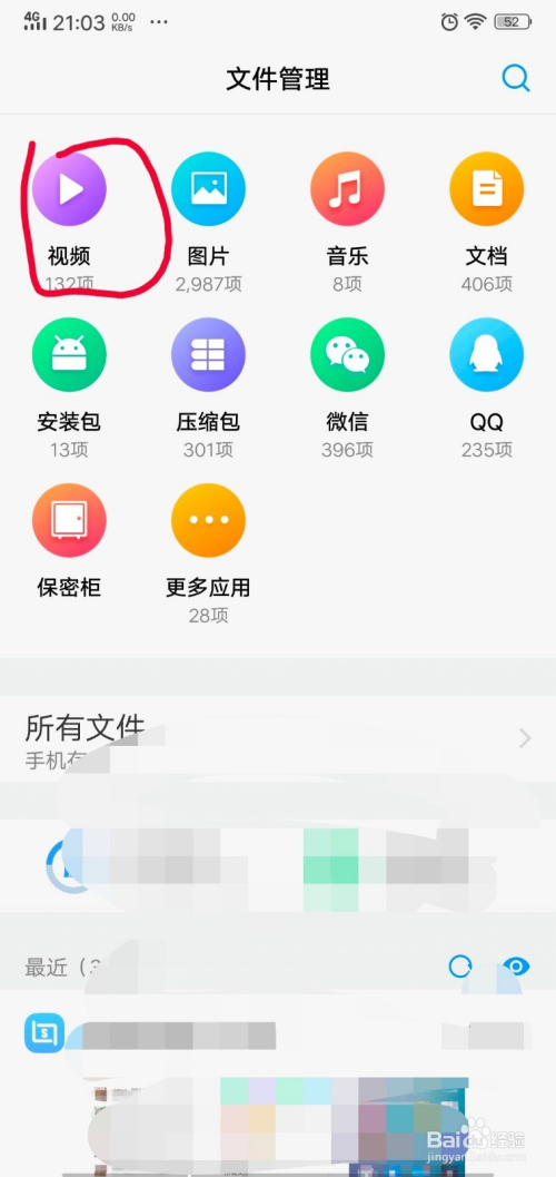 在问件办理界面,我们看到一个”视频“的文件夹,点击进入。此文件夹保留的是手机近期下载的视频,我们就可以找到适才保留的视频了。