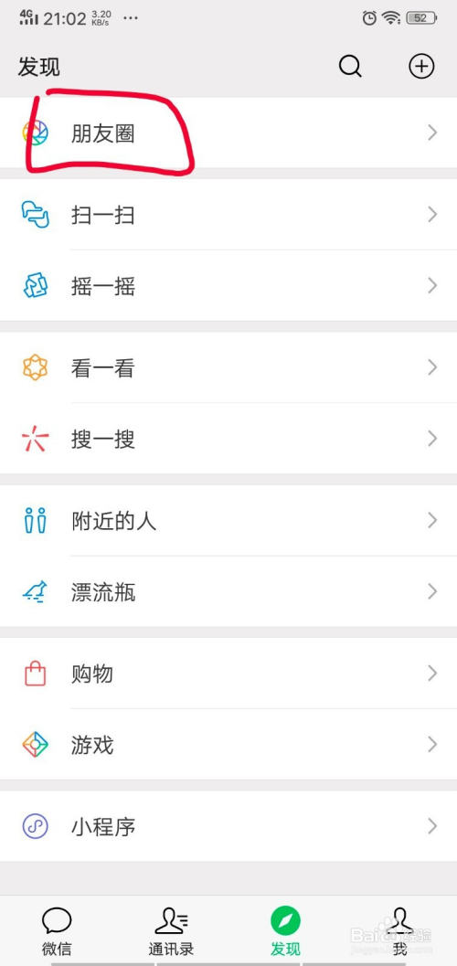 进入“发现”界面后,我们点击“朋友圈”选项,如下图所示。