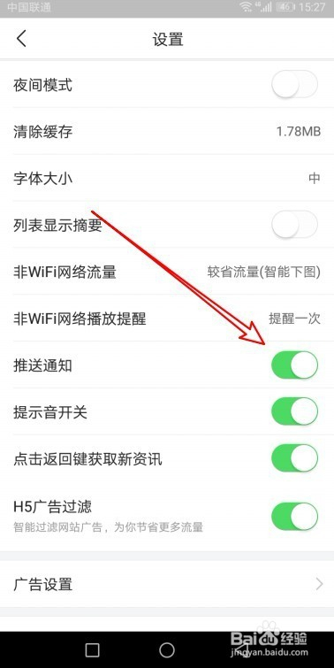 点击推送通知后面的开关,把其设置为关的状况即可。这样我们的手机今后就不会再收到今日头条推送的通知动静了。